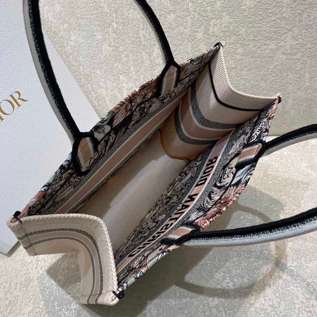 Introduced by Maria Grazia Chiuri, Creative Director of Christian Dior, the Dior Book Tote has become a staple of the Dior aesthetic. Designed to hold all the daily essentials, the style is fully embroidered, a variation of the House’s hallmark pattern with a play on reversed colors. Adorned with the ‘CHRISTIAN DIOR PARIS’ signature on the front, the medium tote exemplifies the House’s signature savoir-faire and may be carried by hand or worn over the shoulder.