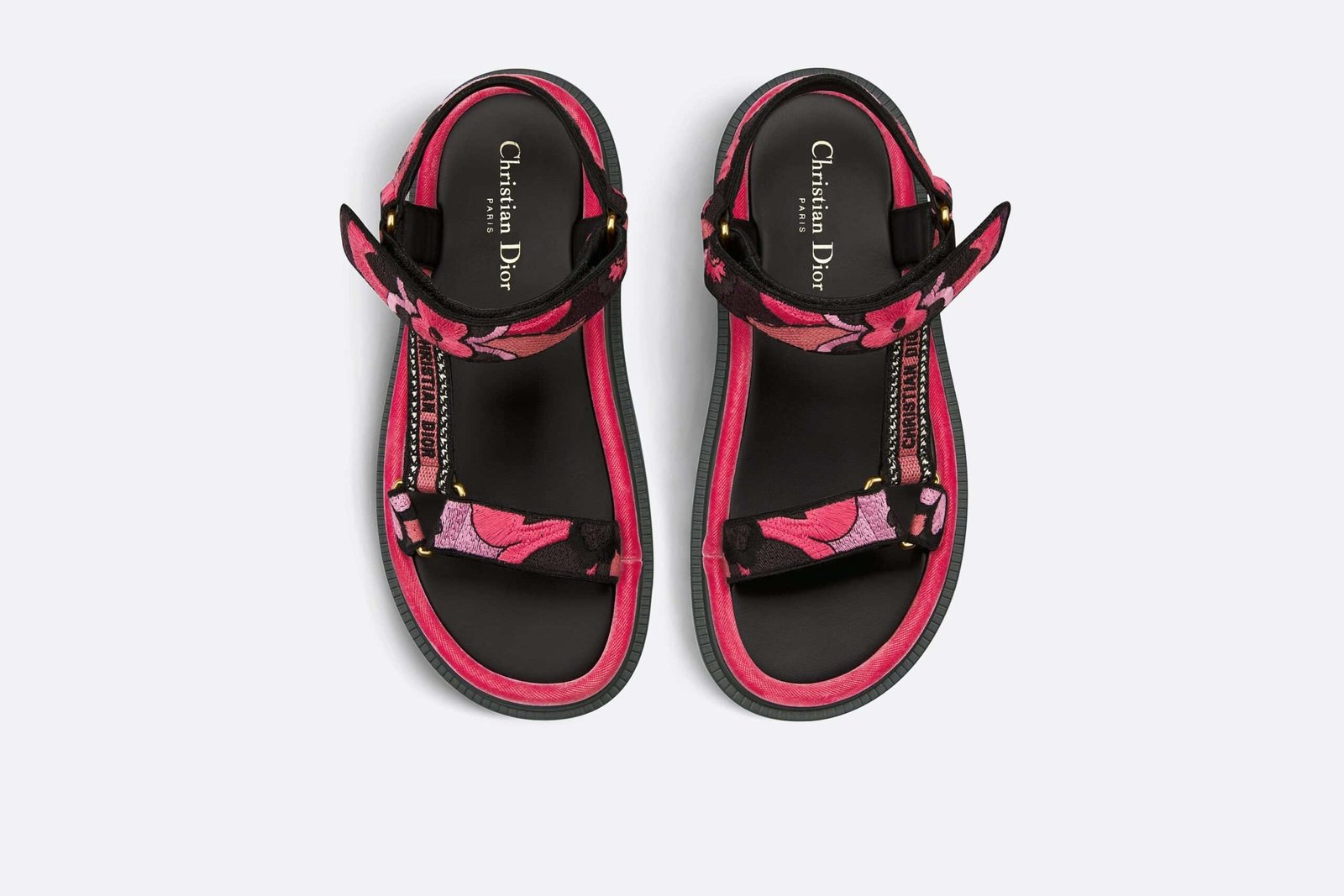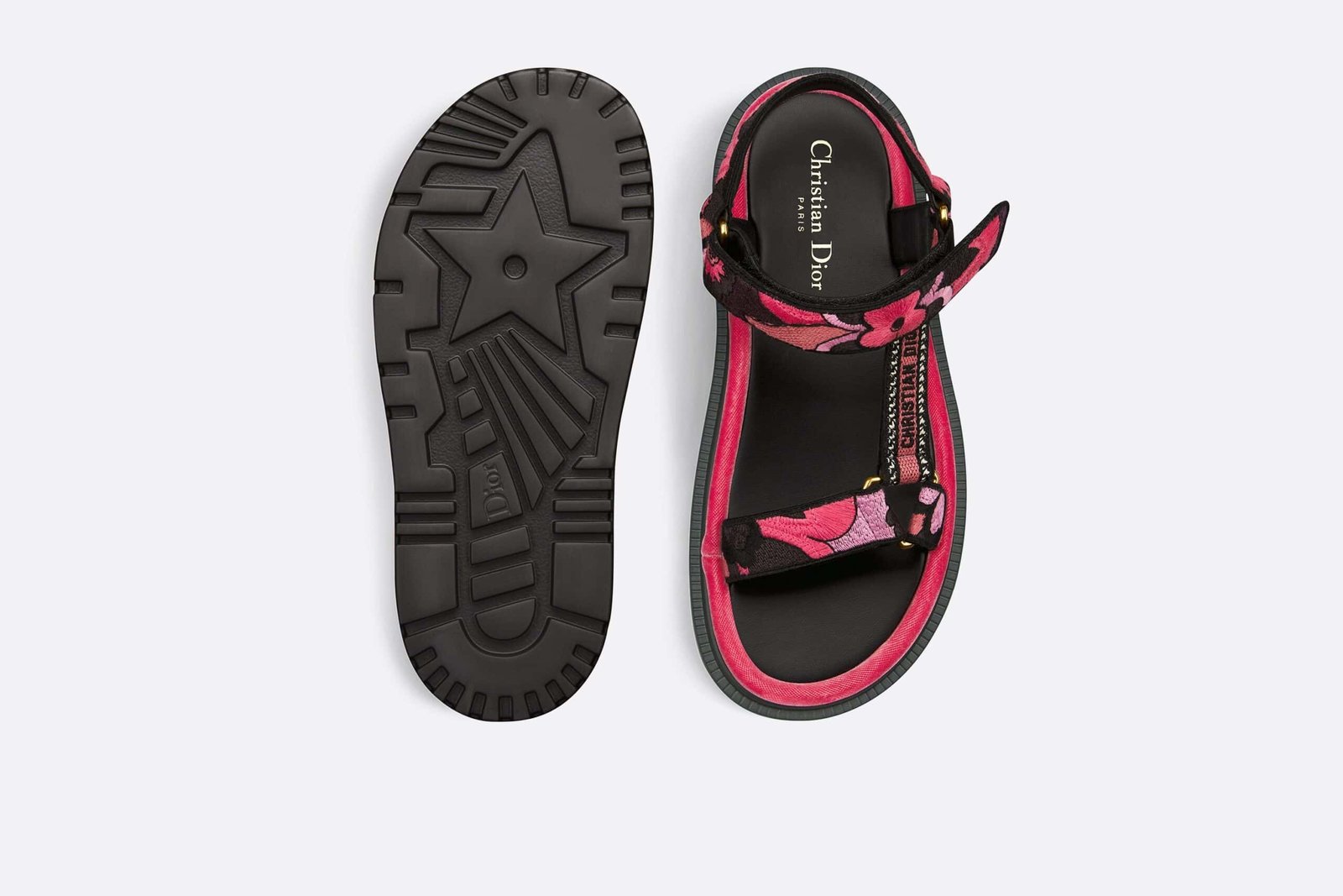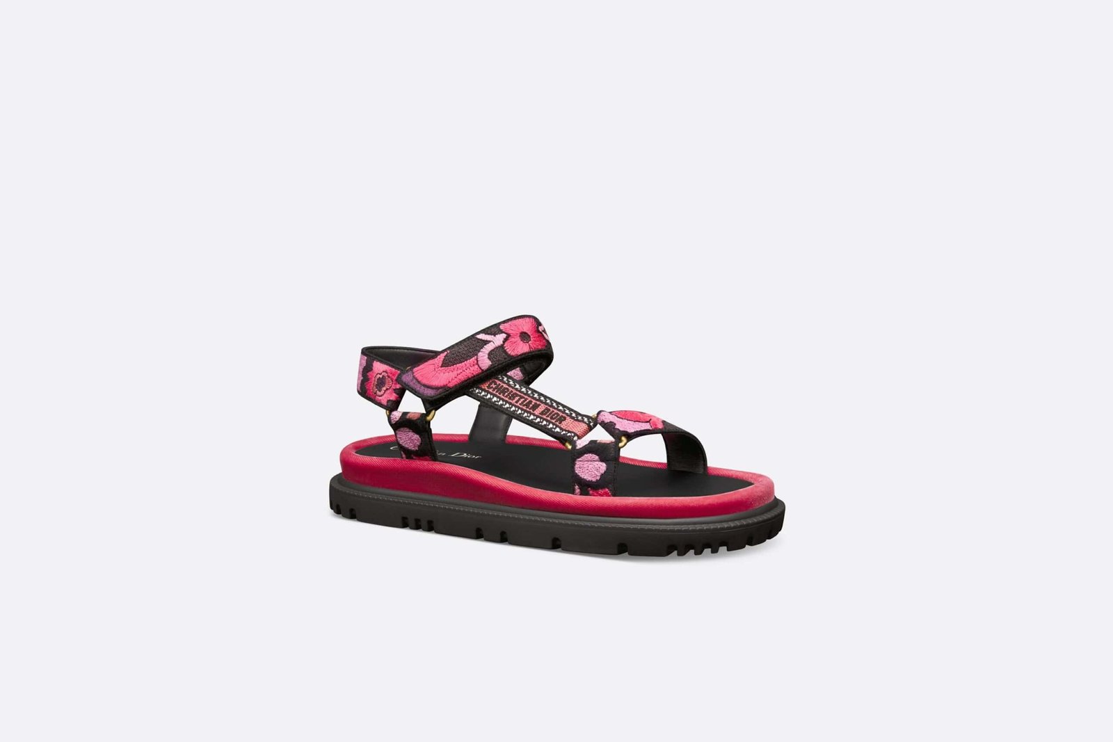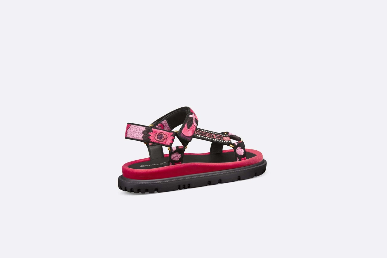 New for the Fall 2023 season, the D-Wave sandal showcases a modern hybrid silhouette. The style displays straps in indy pink multicolor cotton embroidered with the Jardin Indien motif, celebrating Indian-inspired plants in bright colors. The Christian Dior Paris signature embroidered on the side lends an instantly recognizable touch.