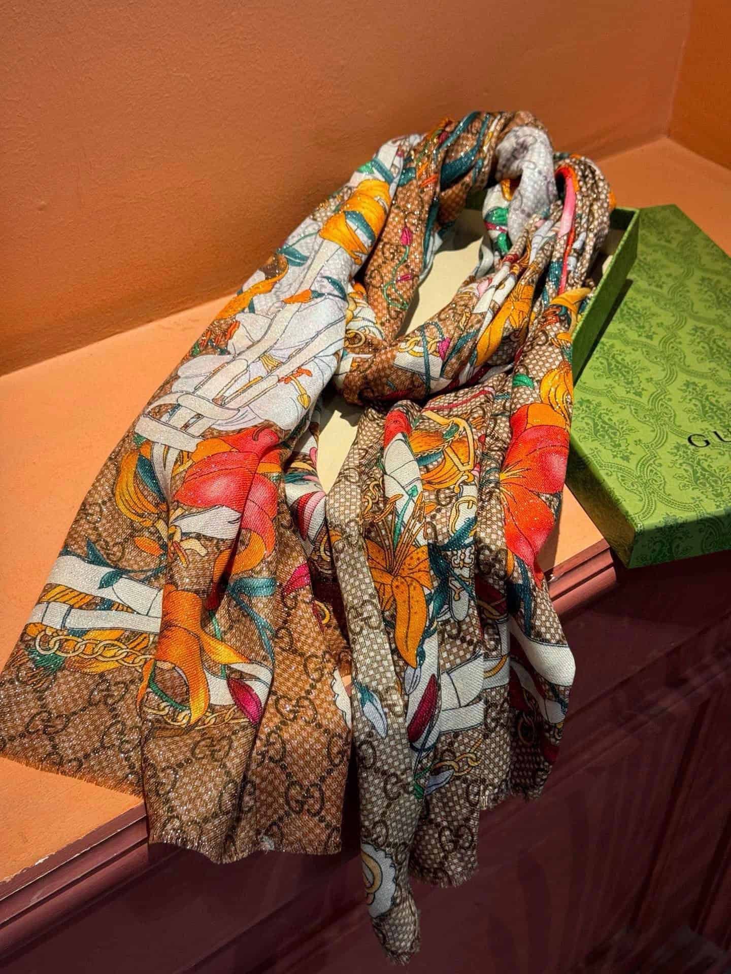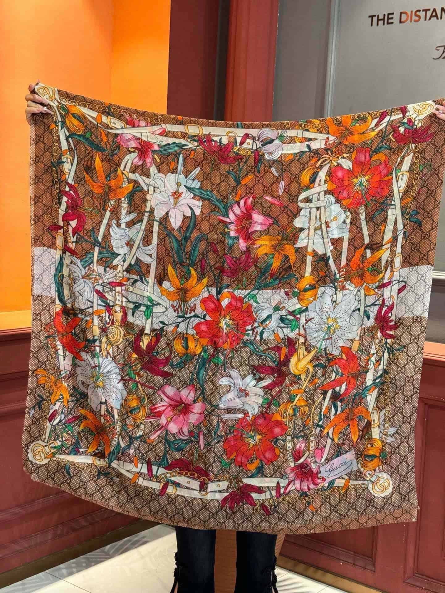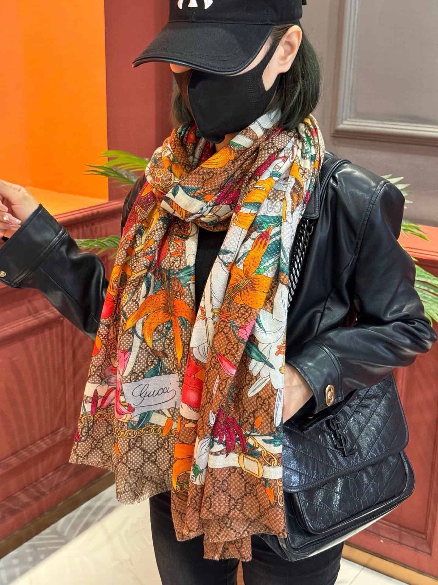This double-sided floral cashmere scarf from Gucci is really high-end! The signature floral pattern is very tasteful when paired with clothing!! The new fusion of Gucci’s signature floral elements and the old floral GG