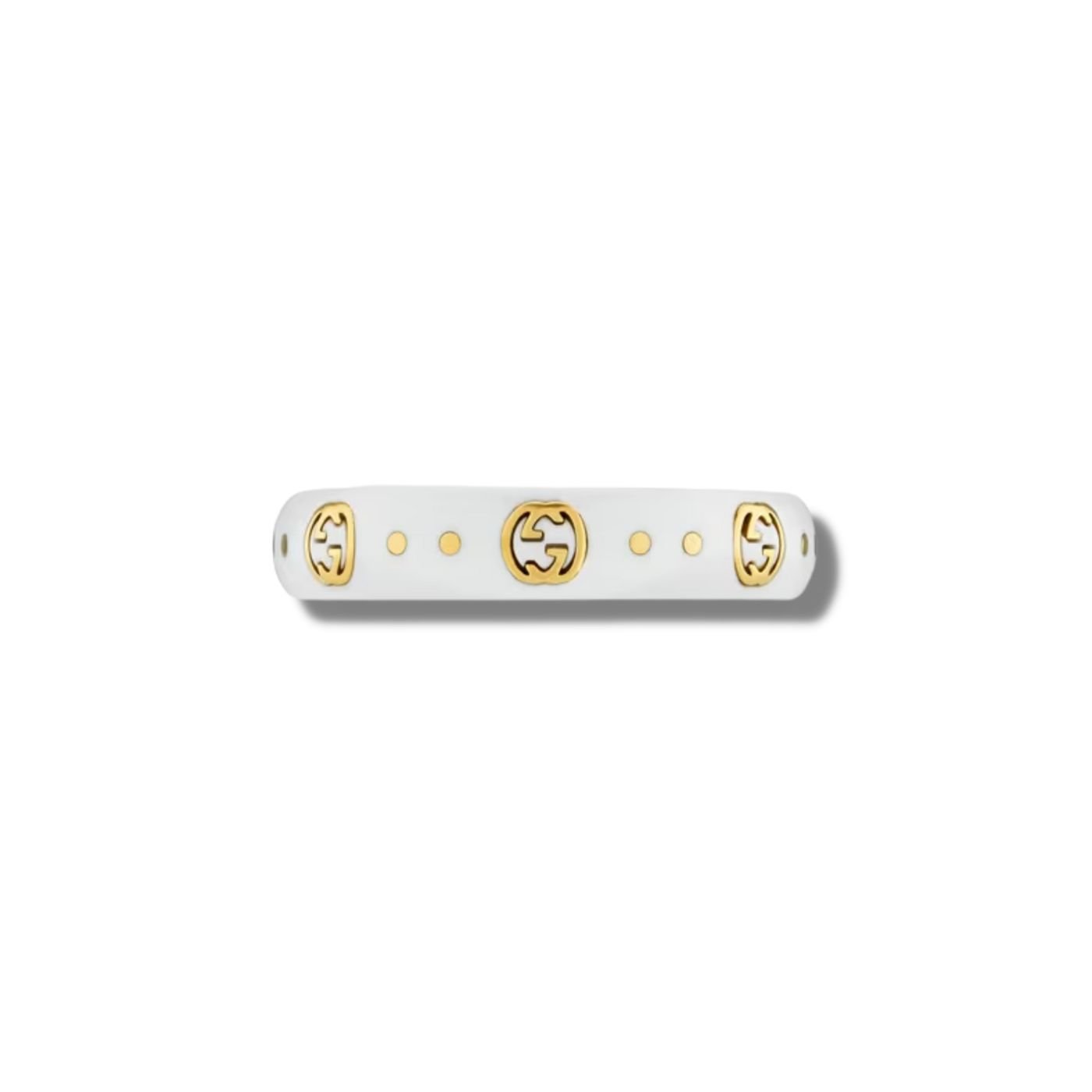 - The Icon collection reprises one of the House’s most emblematic motifs. The Interlocking G, representative of founder Guccio Gucci’s initials, is presented in yellow gold, contrasting against a white synthetic corundum band.