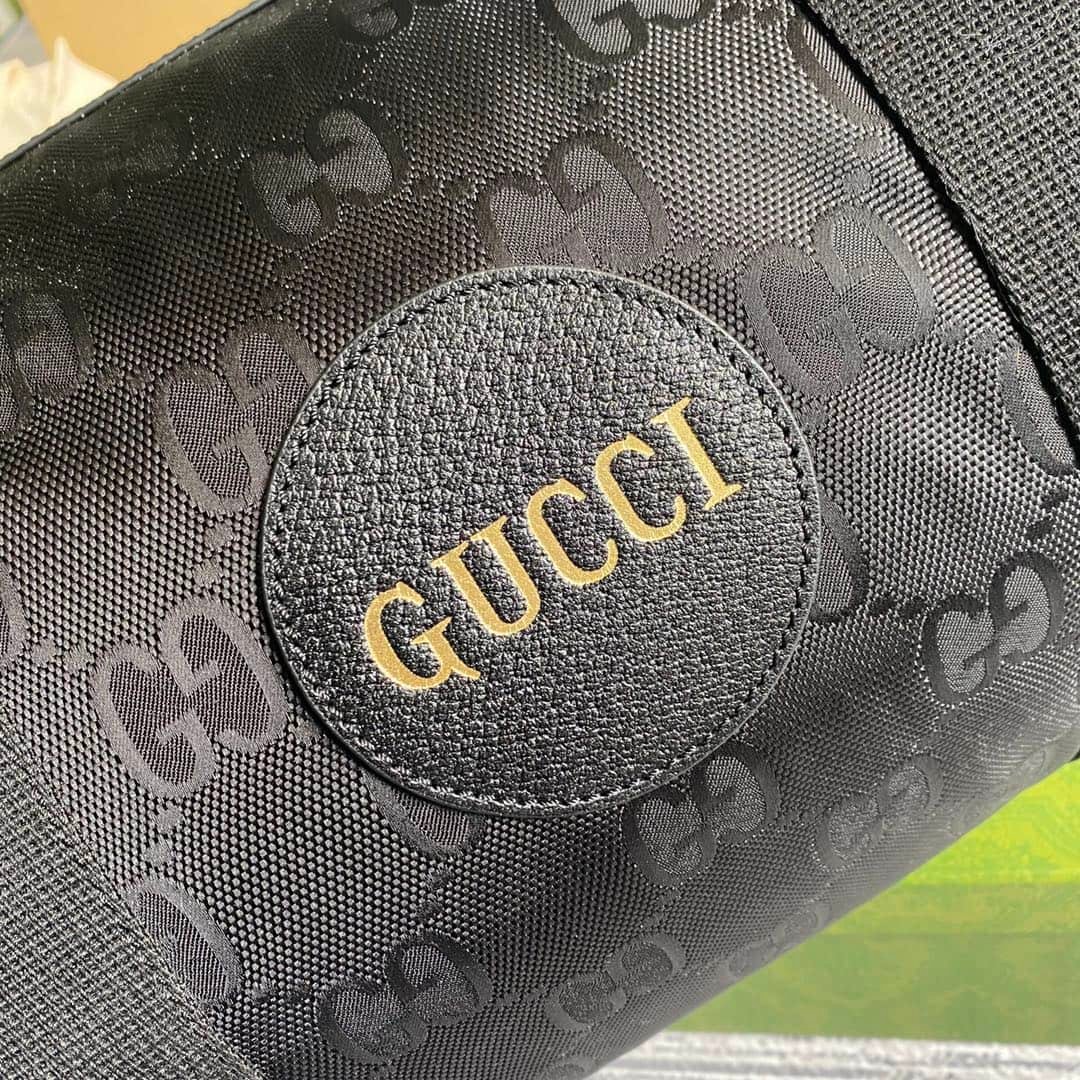- This duffle bag is made from recycled materials and trims, supporting the House’s commitment to sustainability. Gucci Off The Grid is the first collection from Gucci Circular Lines?a concept created to support the House’s vision for circular production. Designed for those mindful of their environmental impact, Gucci Off The Grid uses recycled, organic, bio-based and sustainably sourced materials. Regenerated nylon, crafted using recycled sewing thread and trims, displays the GG pattern against an opaque background in a deep black.