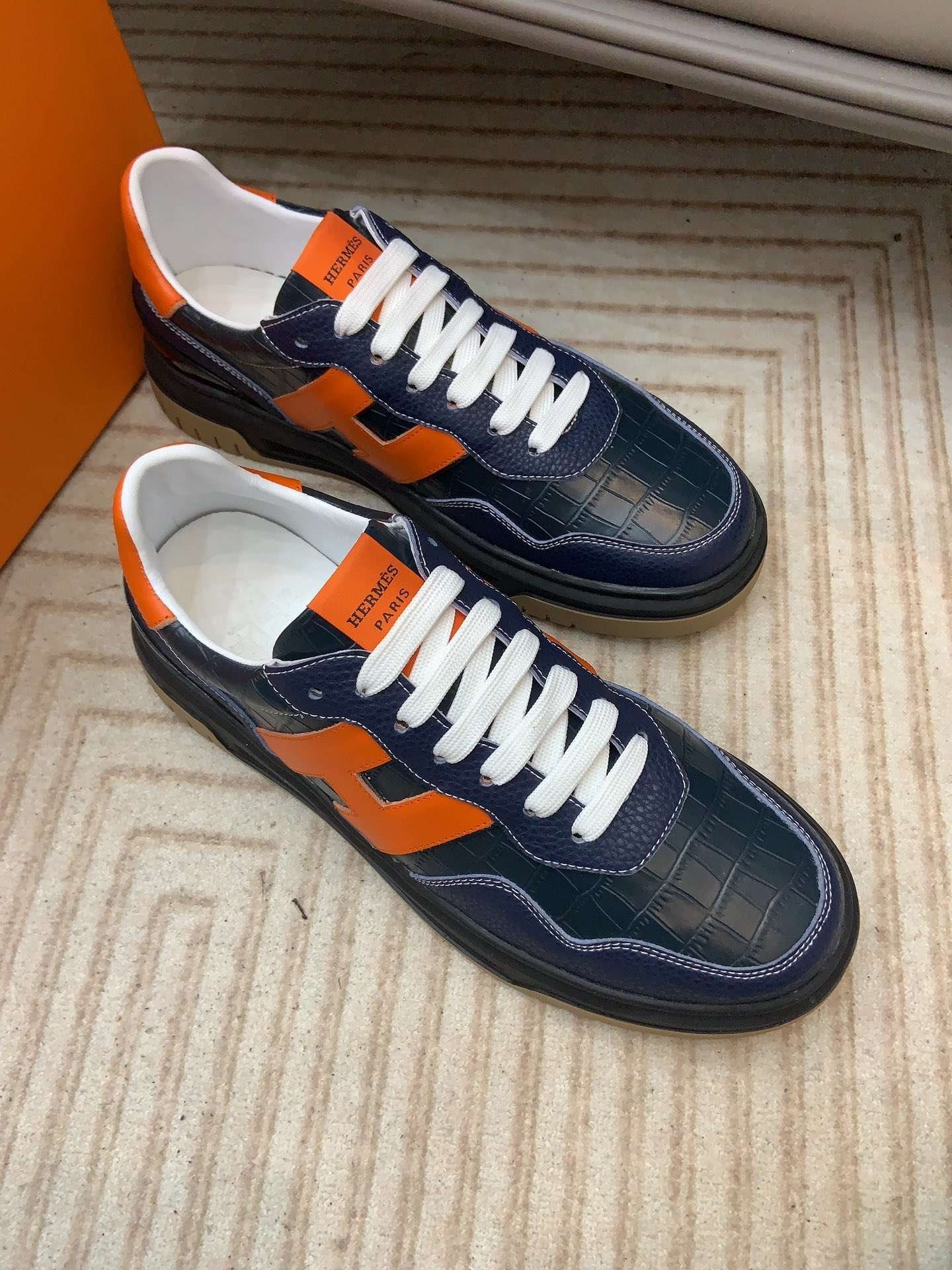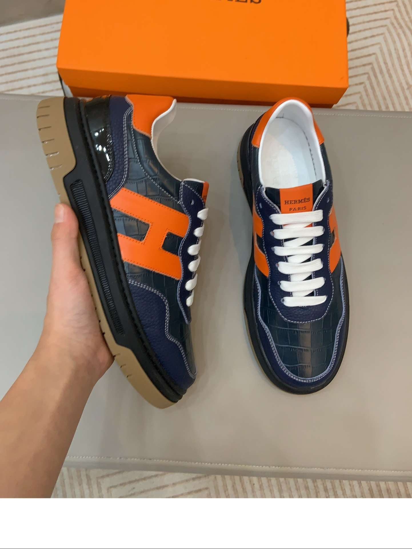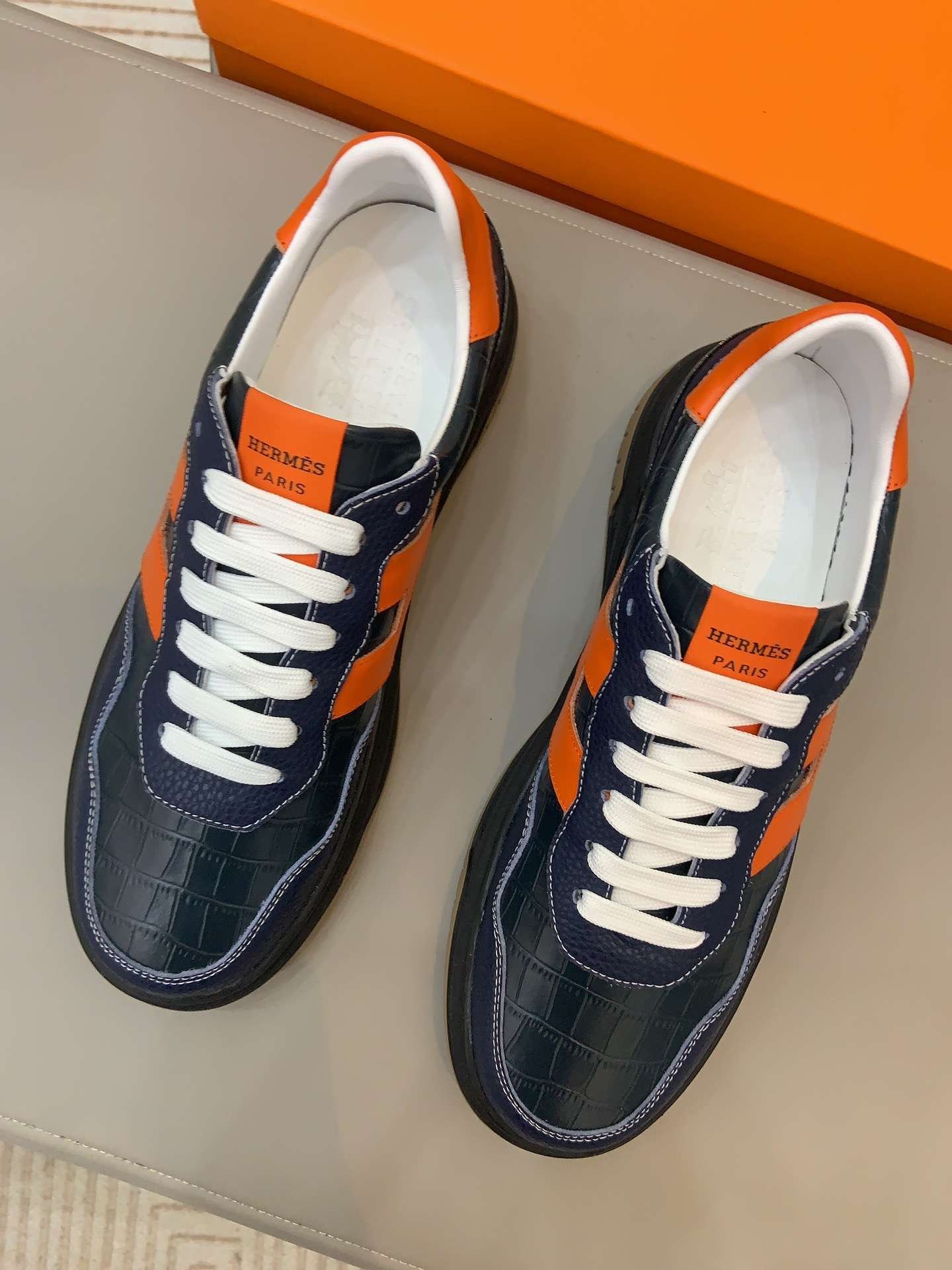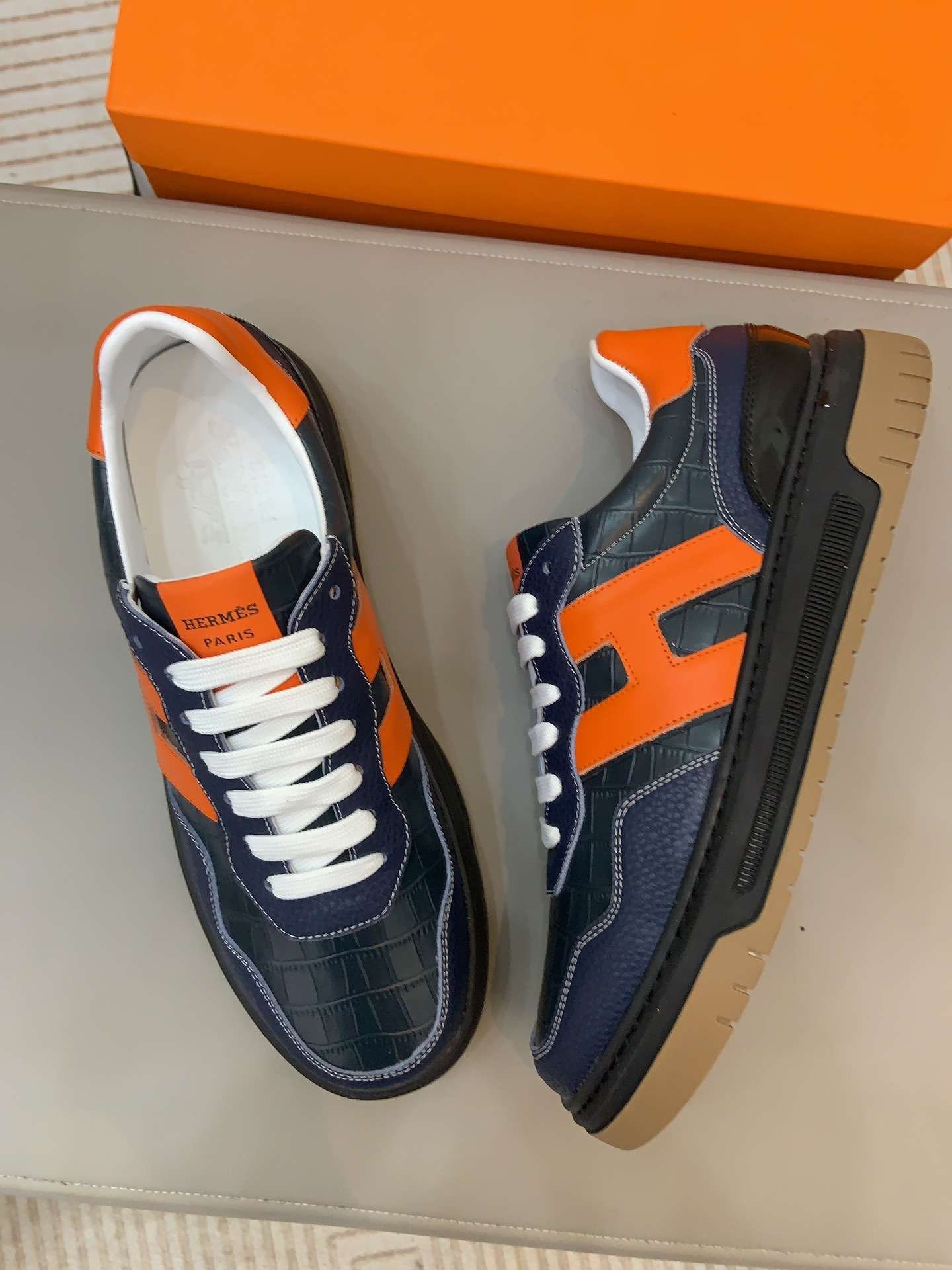 - Minimalist sneaker in printed Epsom with iconic orange sole