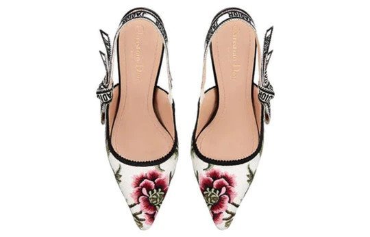 - The J’Adior slingback pump is a prime example of the House’s savoir-faire. Crafted in black cotton, the style is enhanced by a multicolor Dior Petites Fleurs embroidery, a romantic and vibrant homage to Mr. Dior’s passion for florals. The J’Adior embroidered ribbon, the bow and the 6.5 cm (2.5″) comma heel complete the elegant and refined creation, which can pair effortlessly with other Dior Petites Fleurs creations.