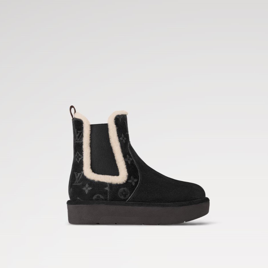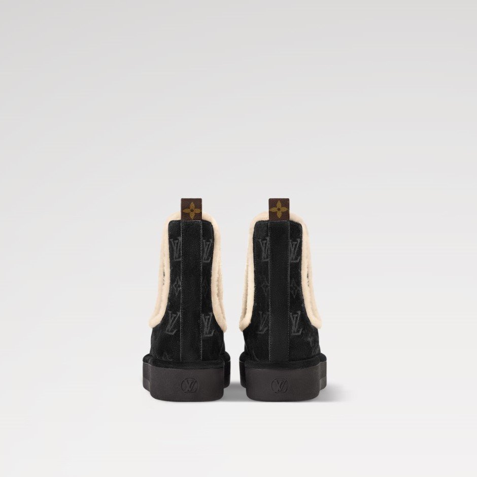 The Aspen Chelsea boot is crafted from velvety suede calf leather, which is partially debossed with the Monogram pattern. This winter-ready style is lined with snug shearling, which also trims the elastic side panels. It is finished with a chunky yet lightweight rubber outsole whose tread is decorated with Monogram Flowers and the Vuitton signature.