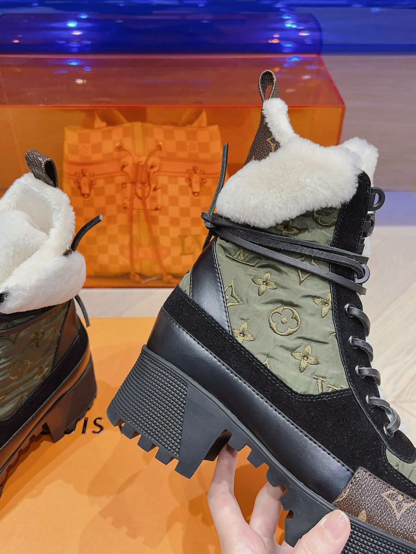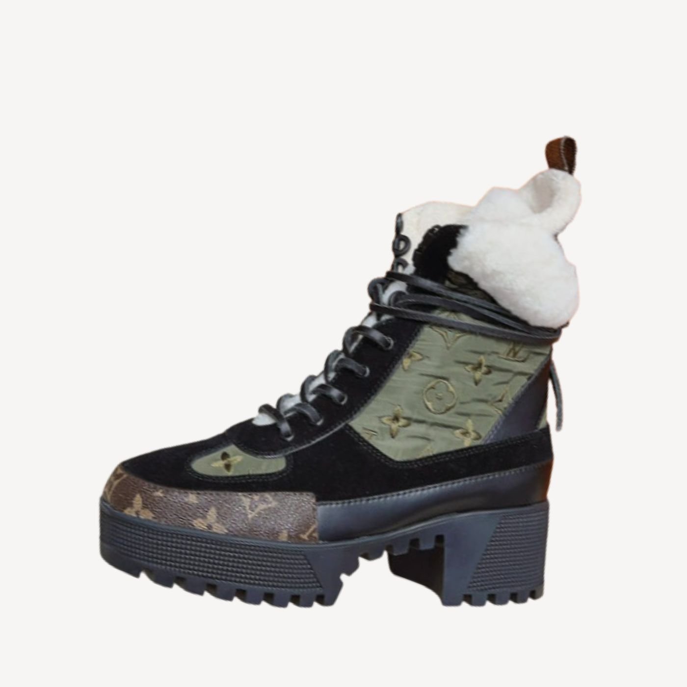 • The Laureate platform desert boot is reworked in soft Monogram wool with coordinating suede calf-leather trim. This emblematic model is instantly recognizable for its long leather laces, which wrap around the ankle. Color-matched to the upper, the lightweight rubber outsole is decorated with a row of LV Initials inspired by the lozine edging of Louis Vuitton trunks Adjustable velcro strap