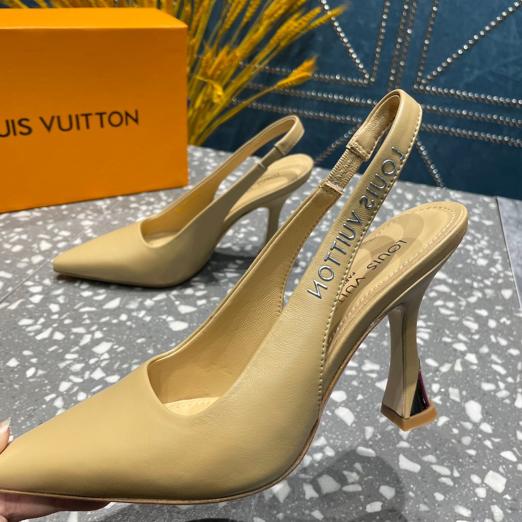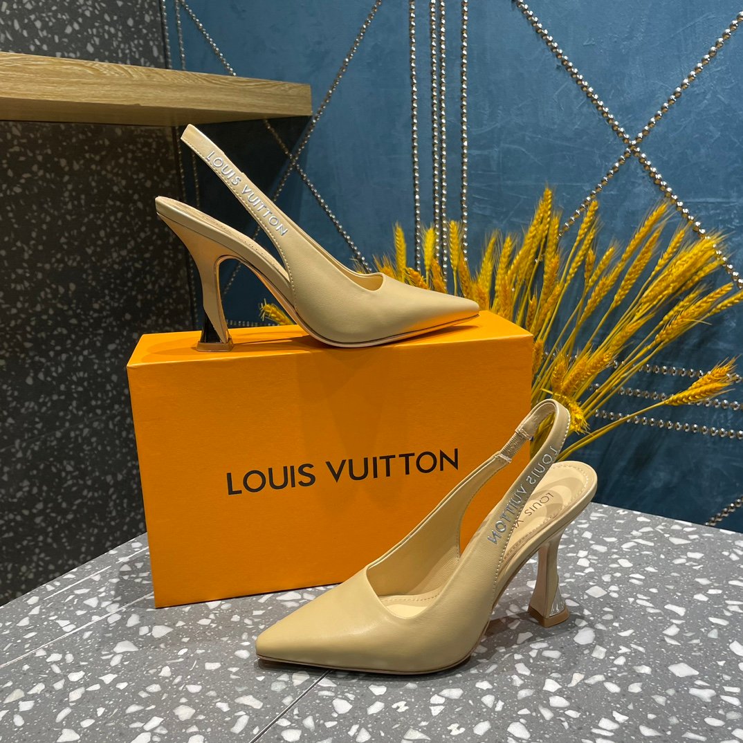 • The Sparkle slingback pump is a refined design crafted from supple. It is distinguished by its pointed toe and feminine flared heel. Silver-tone metal details further elevate this elegant model: a Louis Vuitton signature on the elasticized back strap and an LV Circle-engraved insert on the heel.