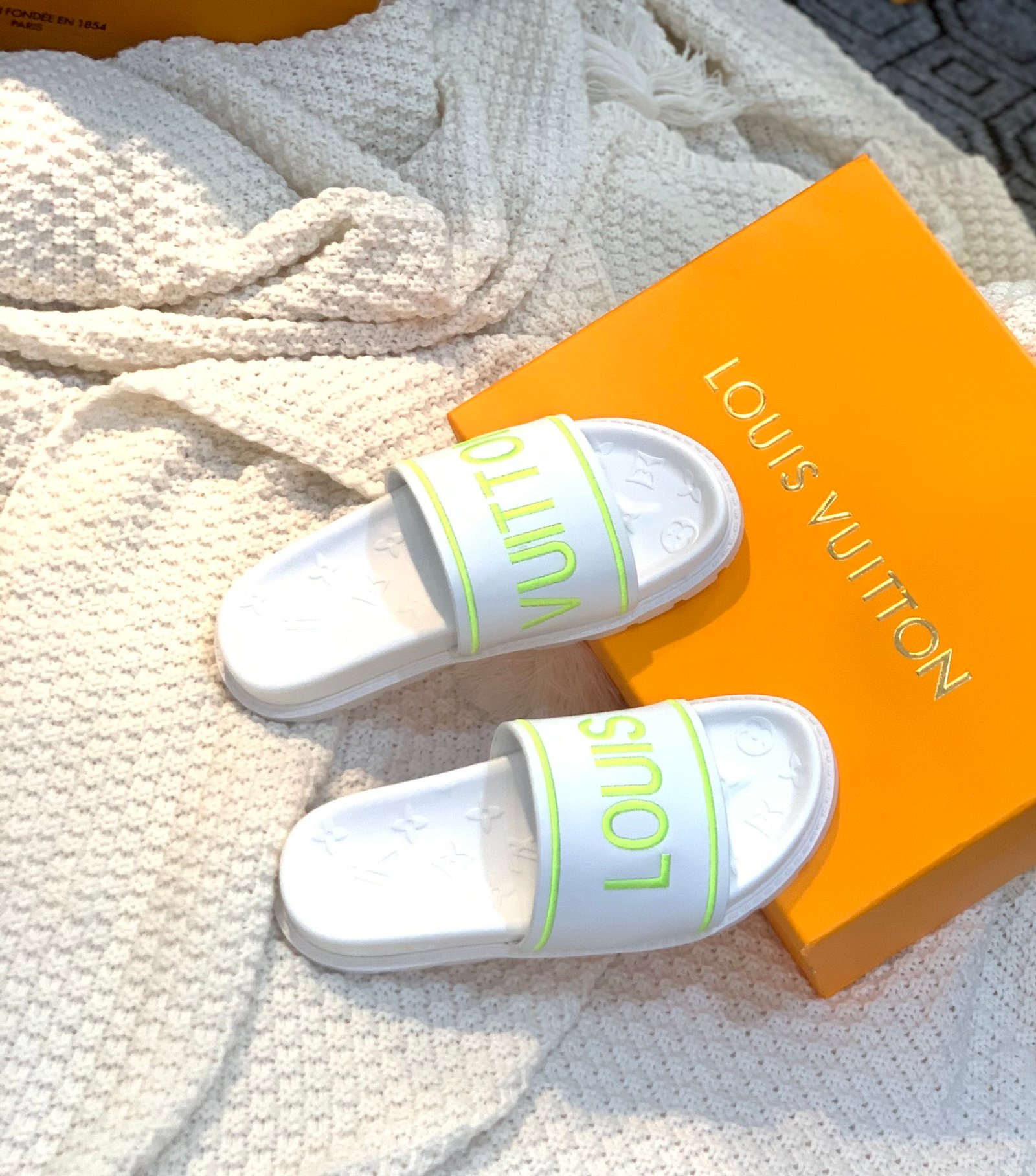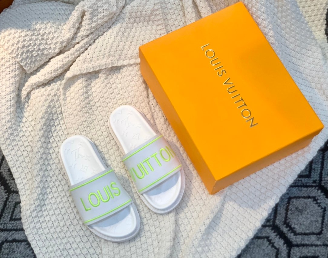 The Pool Pillow flat comfort mule is reinterpreted with a high-frequency-embossed Monogram pattern. The comfortable anatomic footbed is matched to the upper for a colorblock look.