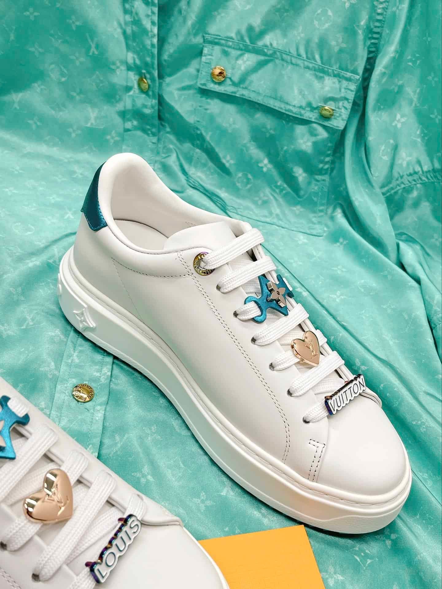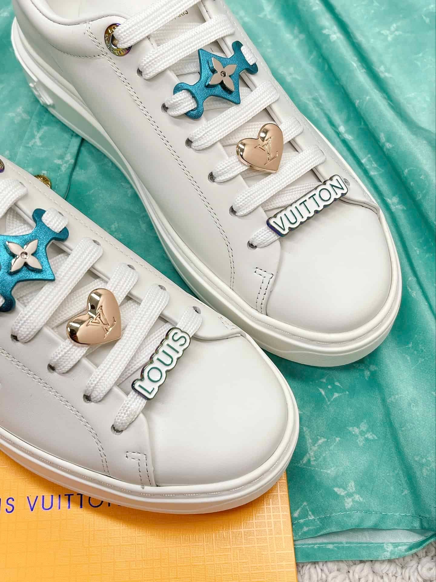 This version of the Time Out sneaker is crafted from smooth with trim at the back. The upper is embellished with three different lace accessories: a Monogram Flower, an LV-engraved heart and a multicolored Louis Vuitton signature. They bring a precious, playful touch to this emblematic design, which is notable for its fashionable elevated outsole.