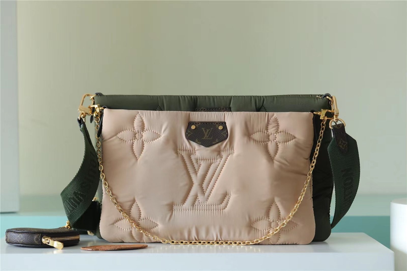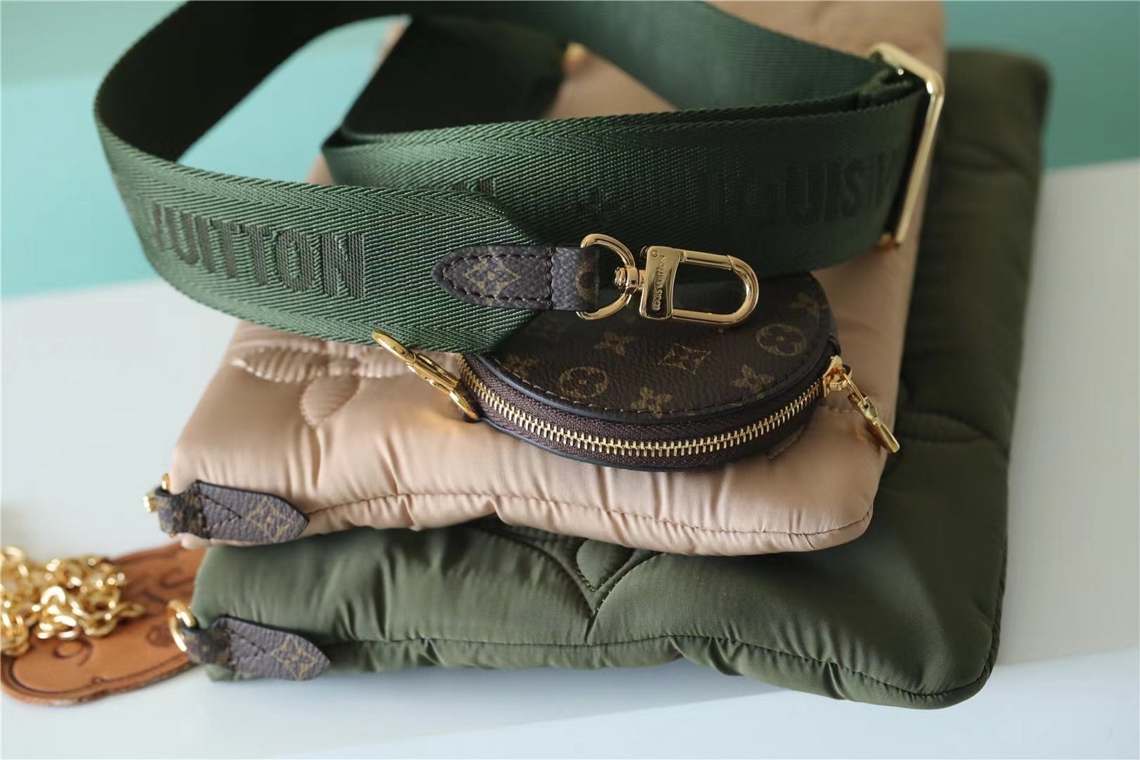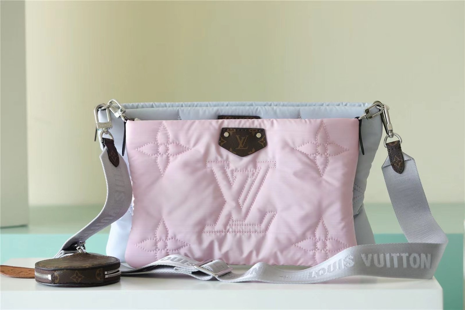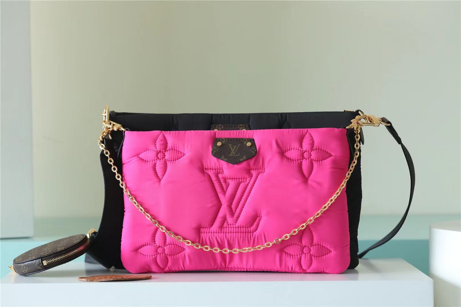 - The Maxi Multi Pochette Accessoires belongs to the season’s LV Pillow capsule. This playful piece provides so many styling opportunities. It can be worn cross-body on the long removable strap and carried as a clutch or by hand on its removable chain, with or without the cute detachable coin purse.