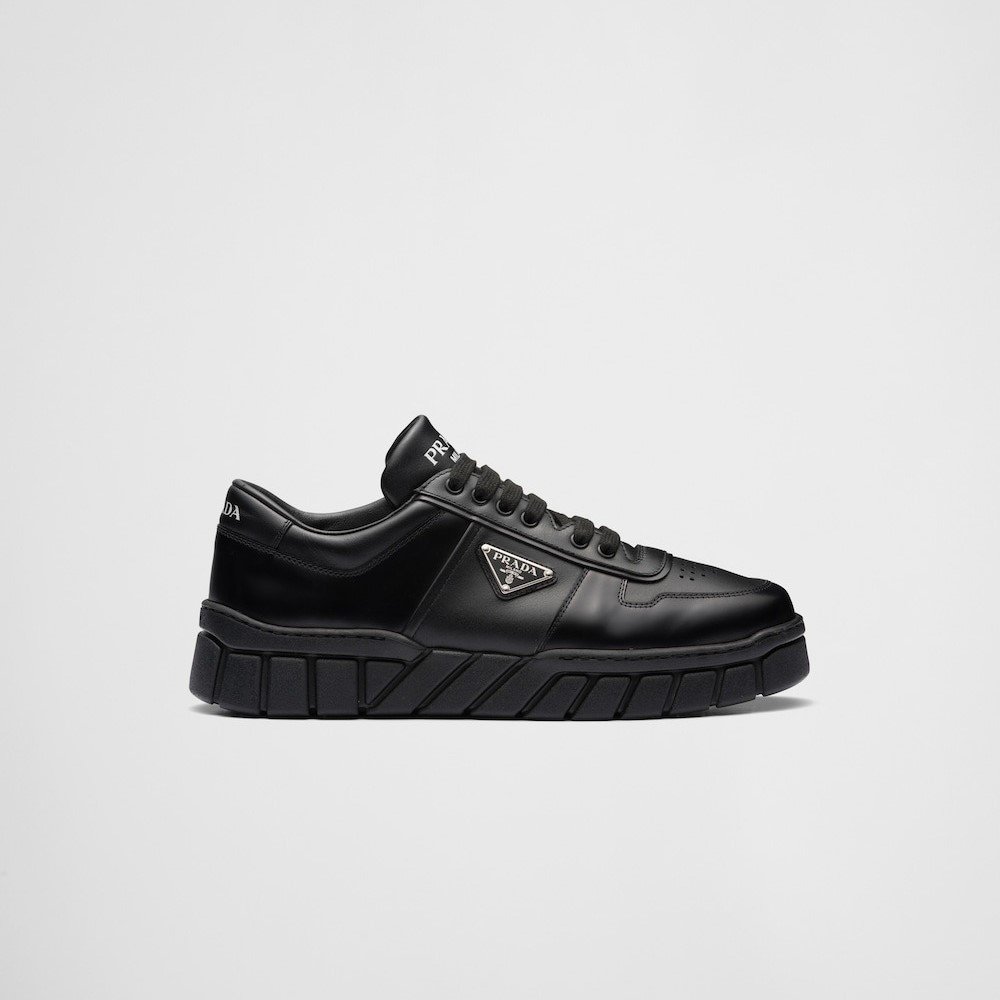 These luxury leather sneakers are defined by a modern design. Voluminous rubber soles provide a sporty allure, while an iconic, enameled-metal triangle logo completes the look.