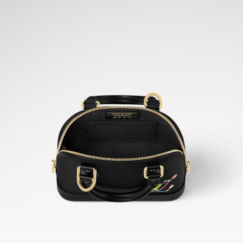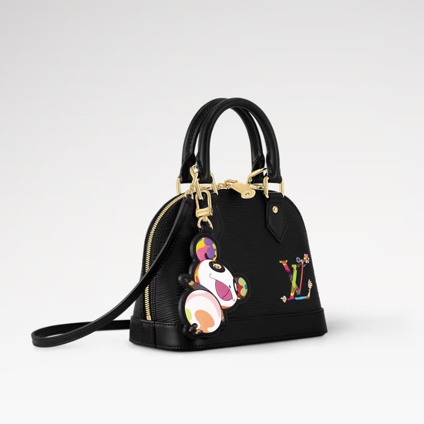 Statement signatures from the re-edition of the Louis Vuitton x Murakami collection refresh the iconic Alma BB handbag with a spirited twist. The front is embellished with a playful reimagining of the LV Initials in the Japanese artist’s vernacular superflat style, which is complemented by a removable Panda charm in bold tones. The elegant Art Deco-inspired design is complete with two top handles, a removable strap and a golden padlock detail.
